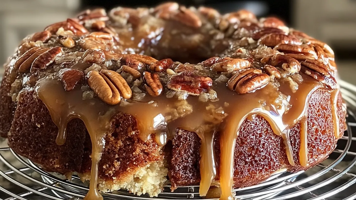 Carefully spoon batter over the pecan caramel layer. Spread evenly without disturbing the pecans underneath. Bake for 40–45 minutes, or until a toothpick inserted in the center comes out clean and the edges are golden brown.